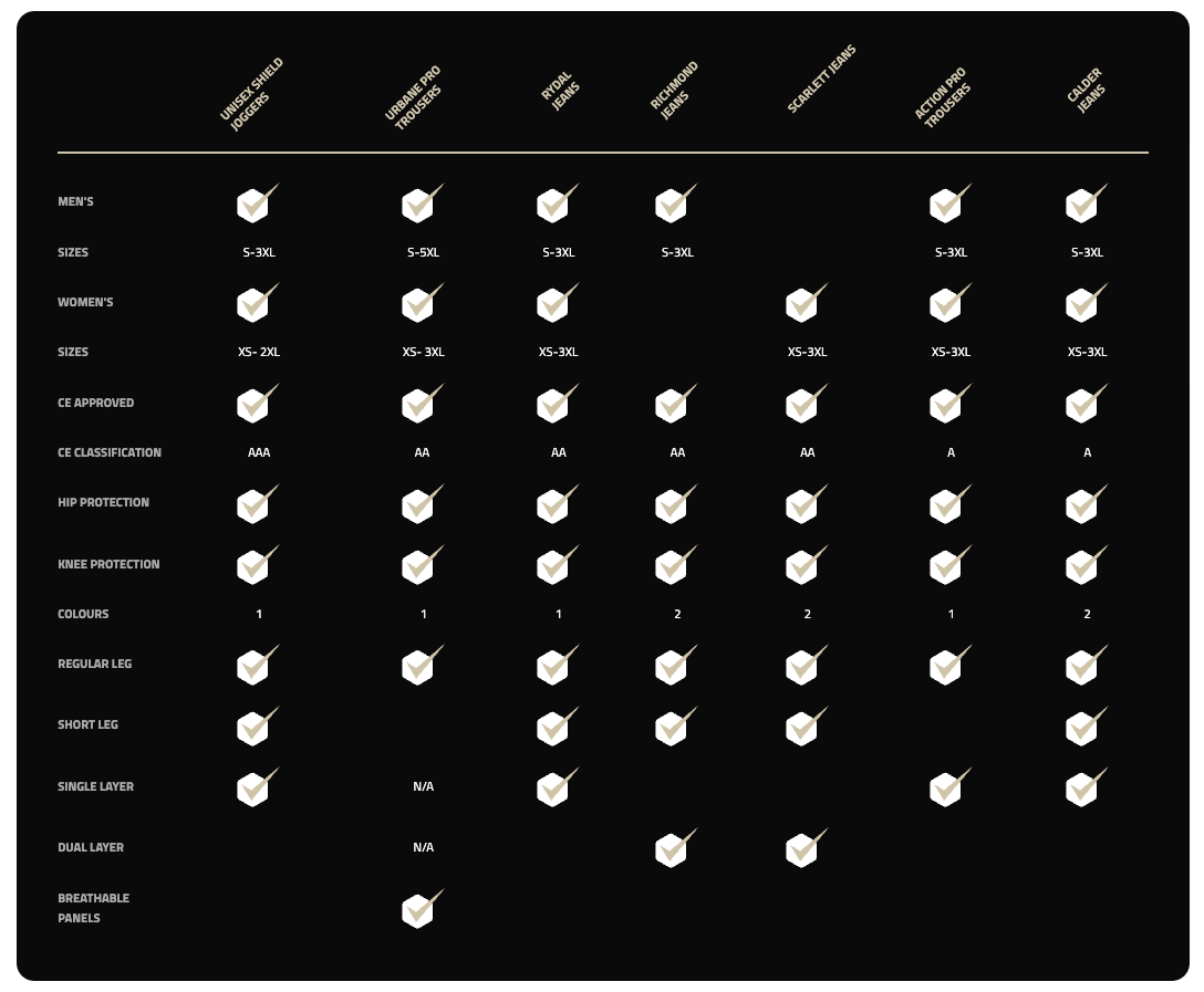Choose an A rated jean trouser for the ultimate in lightweight, comfort and breathability, AA rated for all round performance and AAA rated for the toughest performance, like leather.